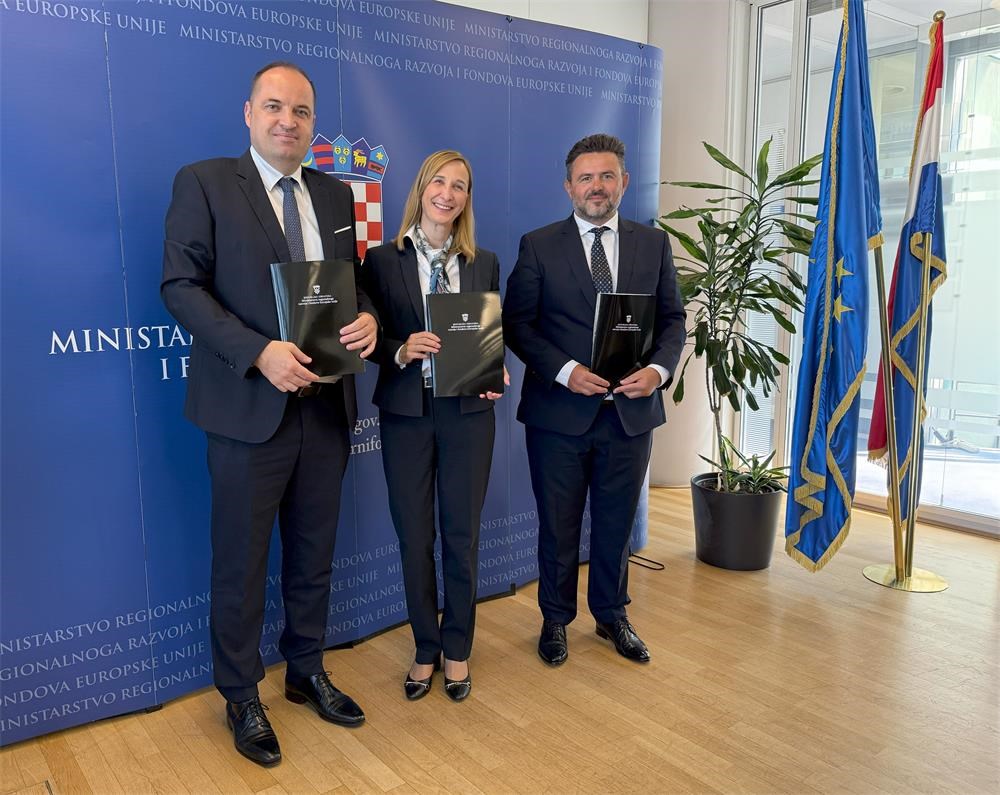 Ministrica regionalnoga razvoja i fondova Europske unije Nataša Mikuš Žigman, predsjednik Uprave HAMAG-BICRO-a Vjeran Vrbanec i zamjenik predsjednika Uprave Ante-Janko Bobetko potpisali su danas 10,8 milijuna eura vrijedan ugovor za provedbu strateškog projekta B Light 2, koji se provodi u okviru Interreg VI-A programa prekogranične suradnje Mađarska - Hrvatska 2021. - 2027.